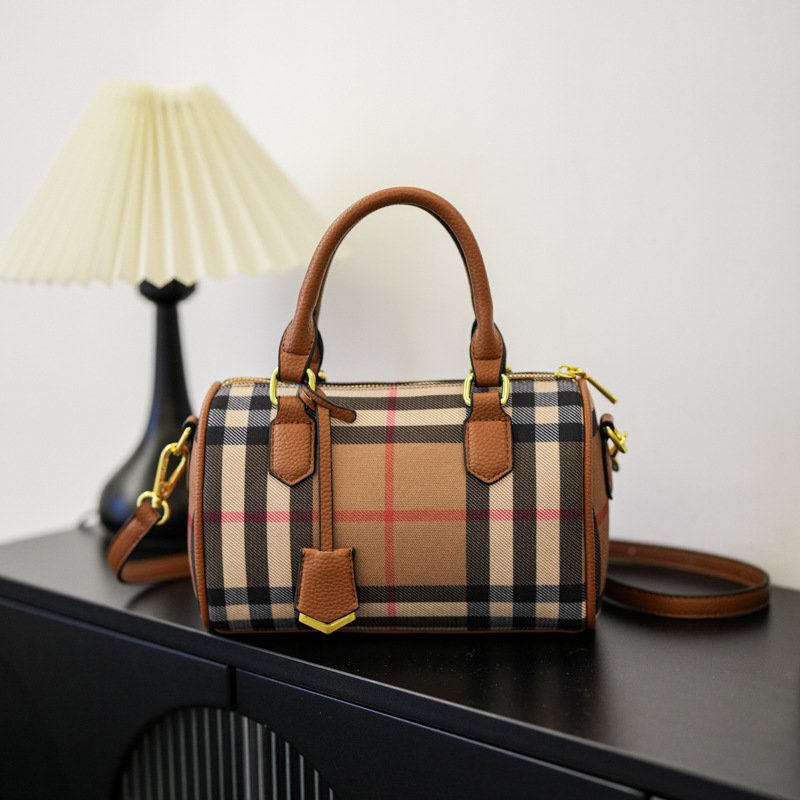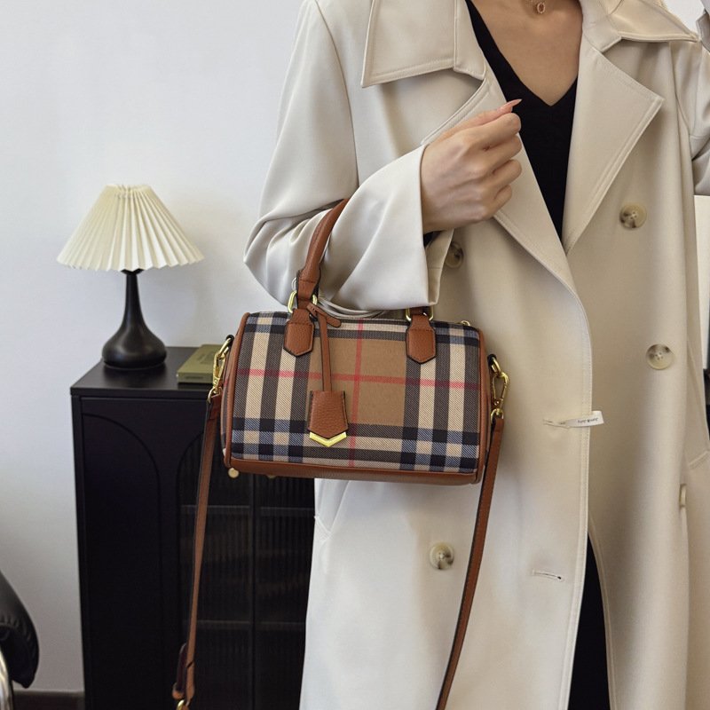 Material: Calfskin leather Bag Size: Medium Lining Material: Polyester Bag Style: Handbag Hardness: Medium Popular Elements: Checkered, Plaid, Patchwork Style: Retro Color: Brown Release Year and Season: Winter 2025 Bag Shape: Cylindrical Opening Method: Zipper Internal Structure: Zippered Pocket